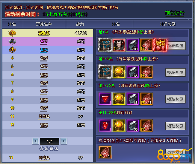 活动说明:活动期间,阵法总战力按获得的先后顺序进行排名