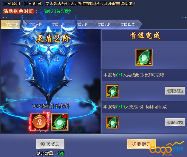 活动说明:灵盾升至指定等级,即可领取海量珍稀道具!