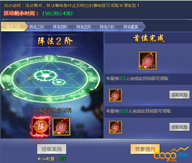 活动说明:阵法升至指定等级,即可领取海量珍稀道具!
