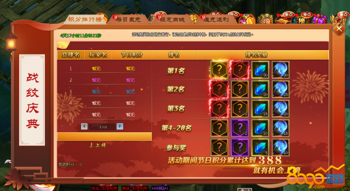 活动说明:活动期间将平台全服玩家获得的节日积分数量进行排名!奖励在次日0点后邮件发送,请勿在最后时刻冲榜