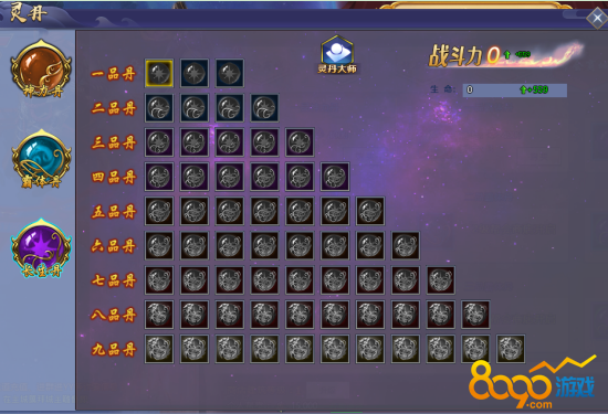 灵丹分为三个品种,每个品种分九品。分别为“神力丹”“霸体丹”“长生丹”;分别对应提升角色的战力、攻击、生命、攻击、及防御属性加成。