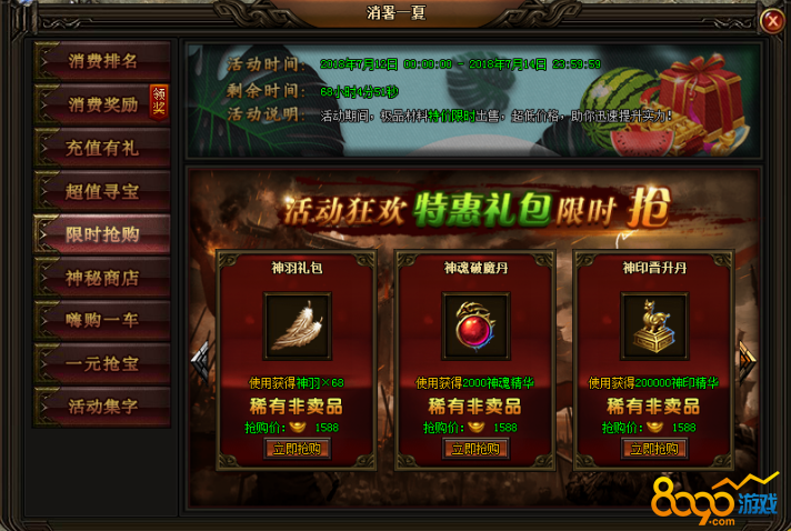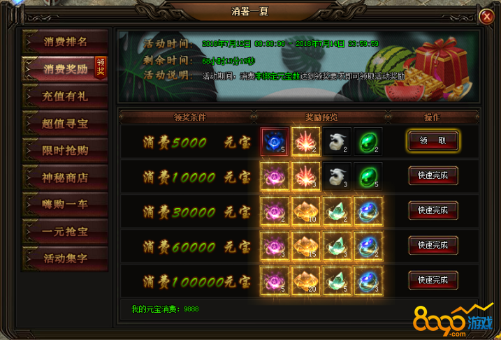 2. 7月12日至7月14日,消费达到一定元宝可获得活动奖励(活动期间,每种奖励仅限领1次)
