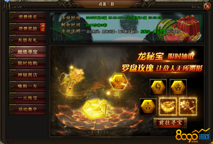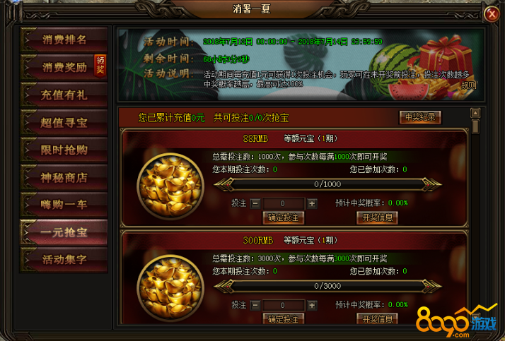 8.7月12日到7月14日,在活动期间,活动期间每充值1元即可活动1次投注机会,投注次数越多,中奖几率越高,中奖获得的元宝为非绑定元宝