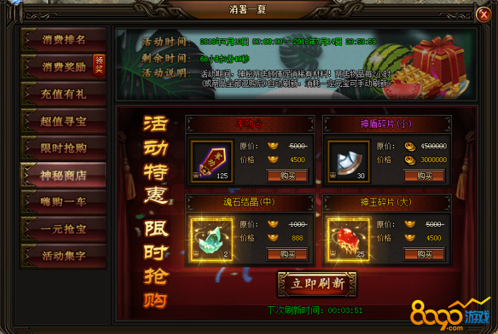 6.7月12日至7月14日日,神秘商店促销稀有材料!商店物品每2小时或商品全部购买后自动刷新,也可消耗一定元宝手动刷新!