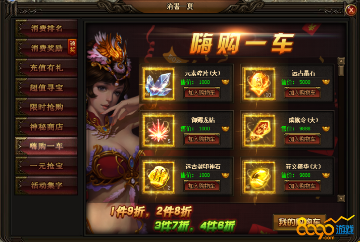 7.7月12日至7月14日,在活动商城界面,可以把想要购买的道具加入购物车,购物车道具越多,结算时折扣越低;1件9折,2件8折,3件7折,4件6折;每人每天可以通过活动结算购买5次