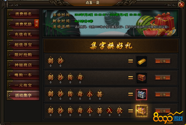 9.7月12日至7月14日日,击败BOSS和小怪可掉落文字,也可在积分装备处兑换稀有文字,集齐文字组合即可兑换相应的奖励