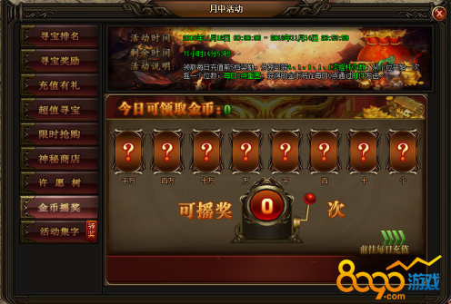 8.10月1日到10月7日,在活动期间,每领取一档每日充值奖励就可分别获得4,1,1,1,1次抽奖机会,抽中的金币会每日凌晨0点通过邮件发送
