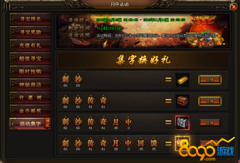 9.11月12日至11月14日,击败BOSS和小怪可掉落文字,也可在积分装备处兑换稀有文字,集齐文字组合即可兑换相应的奖励