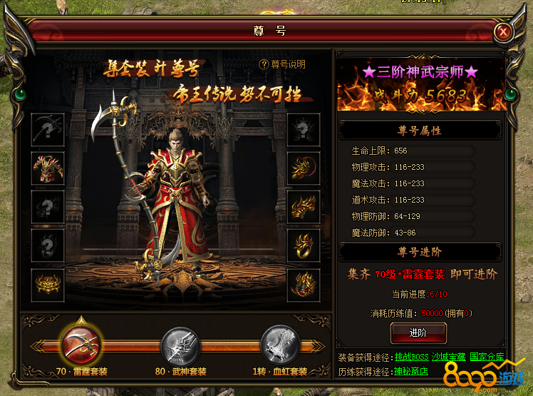 尊号系统可增加角色的攻击和防御,进阶尊号还可以获得炫酷的职业称号。进阶尊号需要角色穿戴一定等级的一套装备(等级大于等于即可)。进阶尊号需要消耗一定历练值,历练值通过消耗历练卷轴获得,历练卷轴在神秘商店处购买。