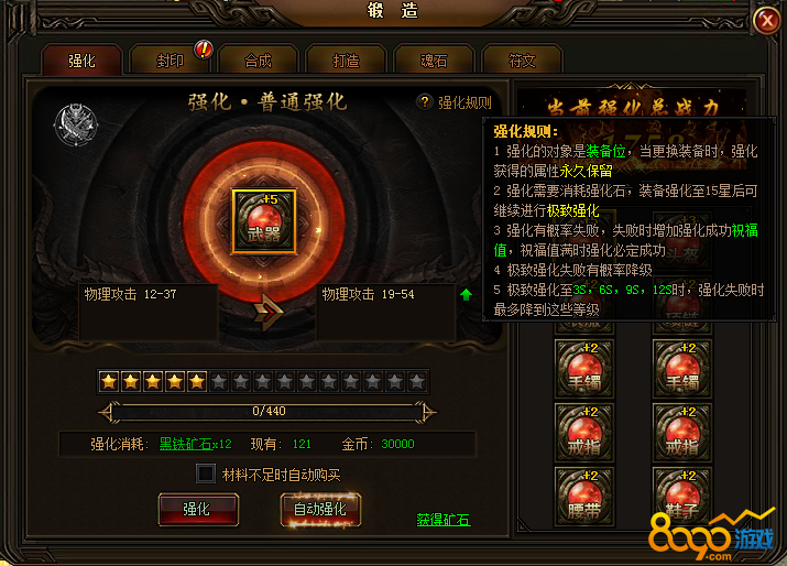 普通强化消耗金币和黑铁矿石,可以强化到15,15以后需要极致强化,极致强化需要消耗金币和玄铁矿石。黑铁矿石可以通过采矿、材料副本、神秘商店、商场购买。20元宝一个。玄铁矿石只能通过神秘商店、商场购买,30元宝一个。普通强化和极致强化都有一定几率失败,但是极致强化失败会降级,可通过消耗元宝保护不掉级。