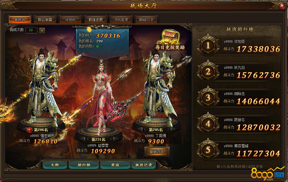 搜索"8090网页游戏"裁决三国竞技场是一个让玩家互相对决的地方,每个玩家每天都可以获得10次挑战。根据玩家的排名会获得不同的奖励。