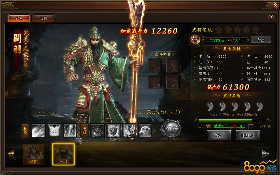 关羽的强在于他的技能和属性加成都非常的高,玩家激活关羽佩戴上之后就能或者12260的战斗力加成,基本属性的加成也有61300的属性加成。下面主要讲一下关羽的技能: