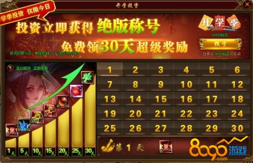 活动内容:活动期间,累计充值10000钻石即可花费48888钻石参与投资,每天即可领取超值奖励!