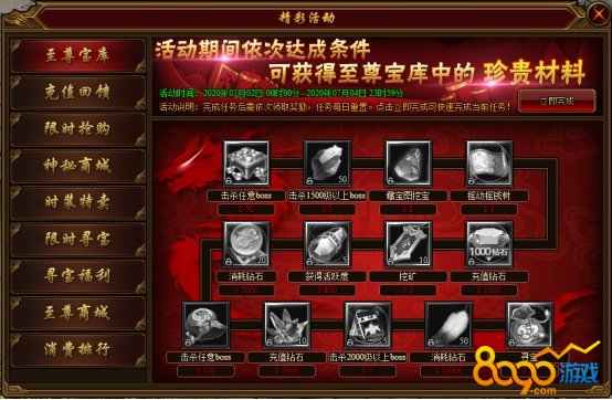 活动内容:活动期间,依次达成条件,可获得至尊宝库中的珍贵材料,任务每日重置。