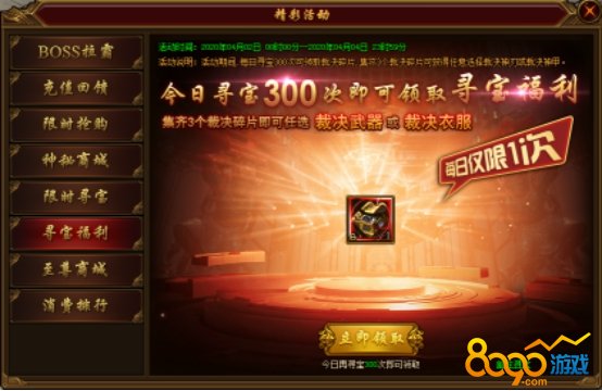 活动内容:活动期间每日寻宝300次即可获得裁决碎片,集齐3个裁决碎片可任意选择一件裁决神装。