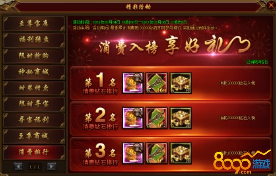 活动内容:活动期间,最低累计消费满100000钻石即可参与排行,排行前3名可获得超级大奖。奖励将在活动结束后通过邮件发放。