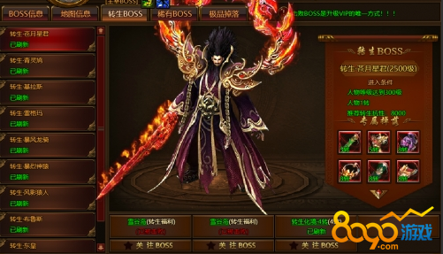 然后是转生装备,转生装备来源于转生BOSS,根据游戏里BOSS指引打就可以了。打转生BOSS的时候要注意,转生BOSS都有转生抗性,抗性达标才能扛得住BOSS的攻击。转生抗性可以通过转生装备和转生等级提升来增加。