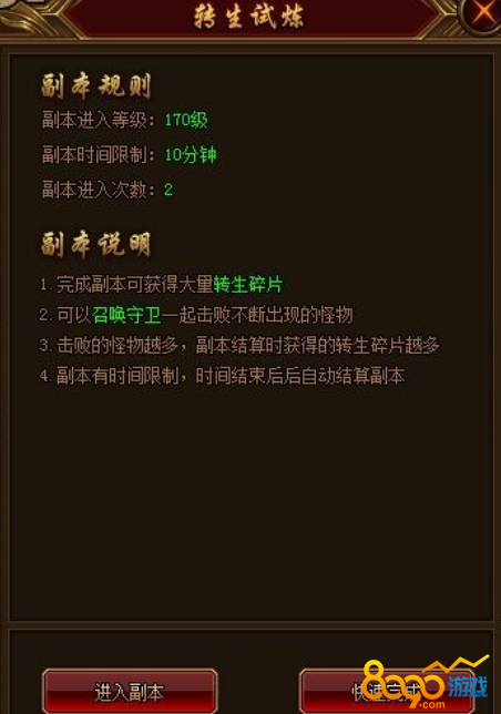 玩家所击败的怪物越多,副本结算时,所获得的转生碎片越多。副本有时间限制,时间结束后,自动结算副本奖励。这个副本主要产出转生碎片,而转生碎片可以用来合成转生丹,帮助玩家快速提升转生等级的。