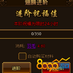 翅膀进阶需要消耗羽毛,这个东西主要的来源是每天的诛魔塔。这里要注意的是,翅膀进阶是有祝福值的,祝福值满才能进阶成功,但是祝福值每24小时会清空,因此大家要注意屯满足够的羽毛再进阶,不然前面用的就浪费掉了。