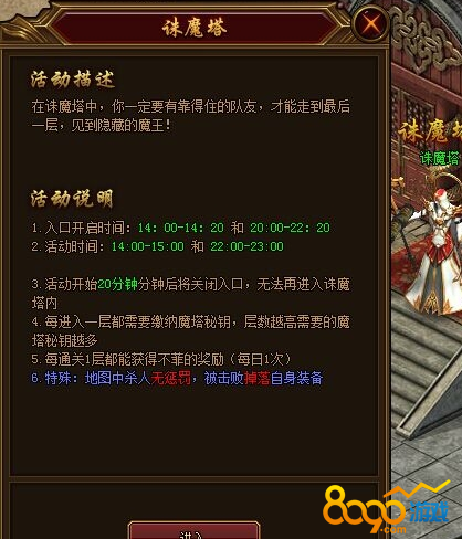 玩家等级需要满足220级时,才能参加诛魔塔的日常活动,这项活动每天开放两次。其中,入口开放时间为每天14:00-14:20和20:00-22:20,而活动参与时间为14:00-15:00和20:00-23:00。