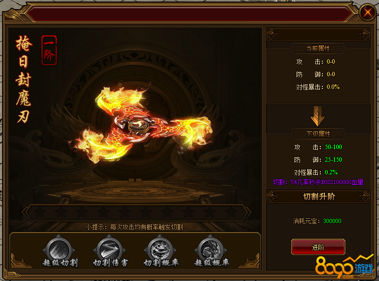超级切割:激活后在每次攻击BOSS的时候都有概率触发超级切割,秒杀BOSS 5%的血量