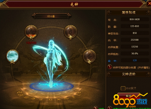 裁决战歌元神系统有风、火、雷、电四大元素,元神升级需要收集灵气对这四大元素进行填充。