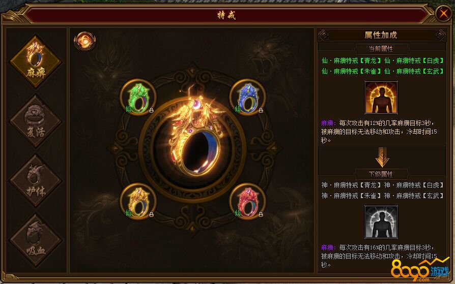 麻痹戒灵:穿齐4件戒灵可激活,麻痹效果在攻击敌人时有概率麻痹对方,(无法移动、施法、攻击)