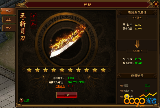 玄兵升级后可以获得大量的暴击率和暴击伤害属性。