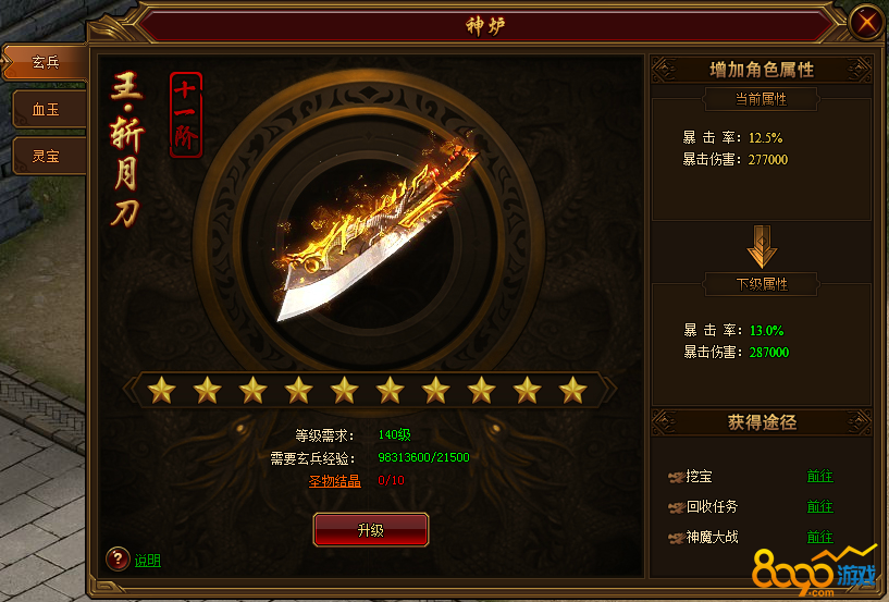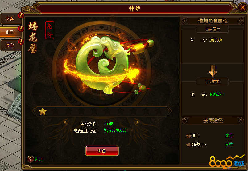 8090裁决战歌神炉系统内可以培养玄兵、血玉、灵宝三种特殊装备、每种装备开启对应不同的等级。