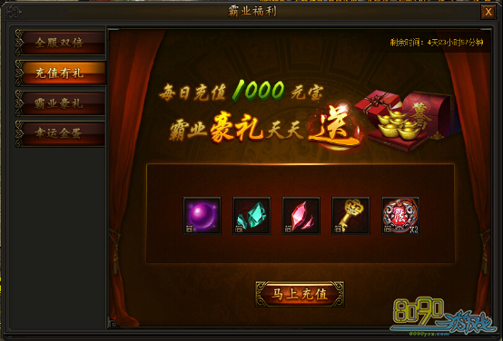 活动期间,充值1000元宝即可领取特惠大礼包,每天只能领取一次。