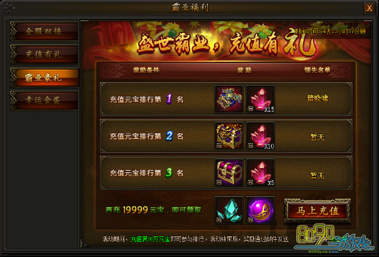 活动期间,累计充值一定元宝即可领取海量奖励。充值元宝数满30w可参与排行,排行前三即可获得对应霸业装备和极品首饰奖励。