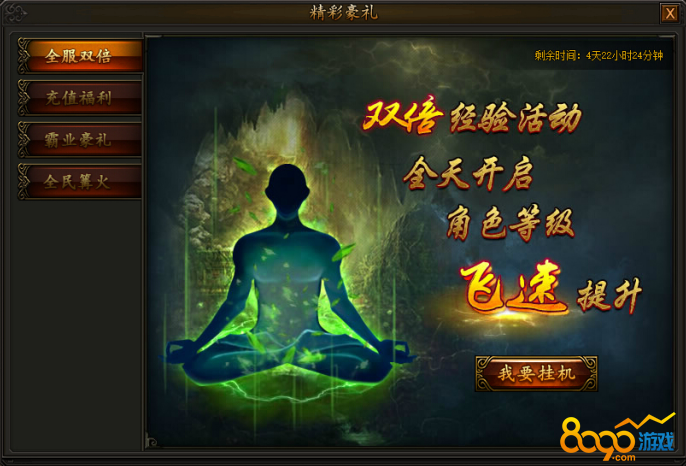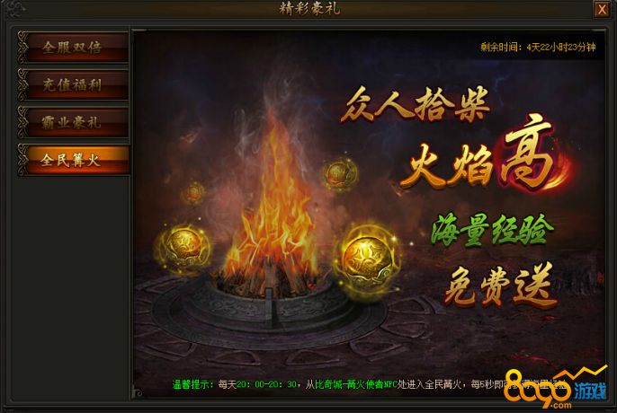 活动期间,每天20:00篝火开启,80级及以上玩家可从比奇城-篝火使者NPC处进入场景,每5s即可获得大量经验奖励;