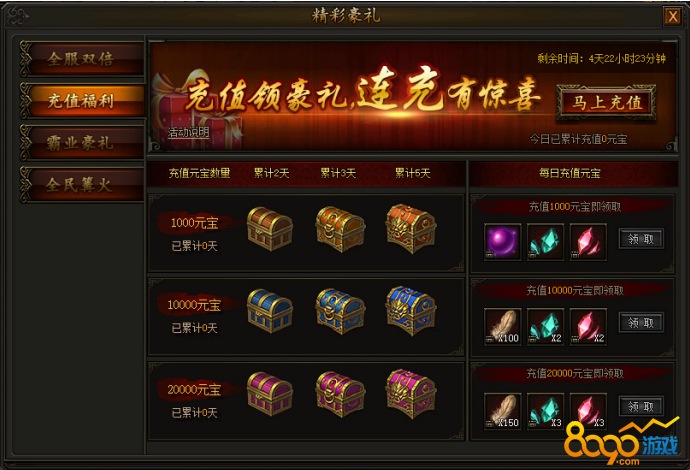 活动期间,充值满一定数量元宝,即可领取每日充值元宝对应档奖励,每档奖励每天均可领取一次,同时累计充值元宝满一定数量且达到要求天数,还可额外领取对应累计天数充值元宝对应档奖励,机会只有一次,不容错过。