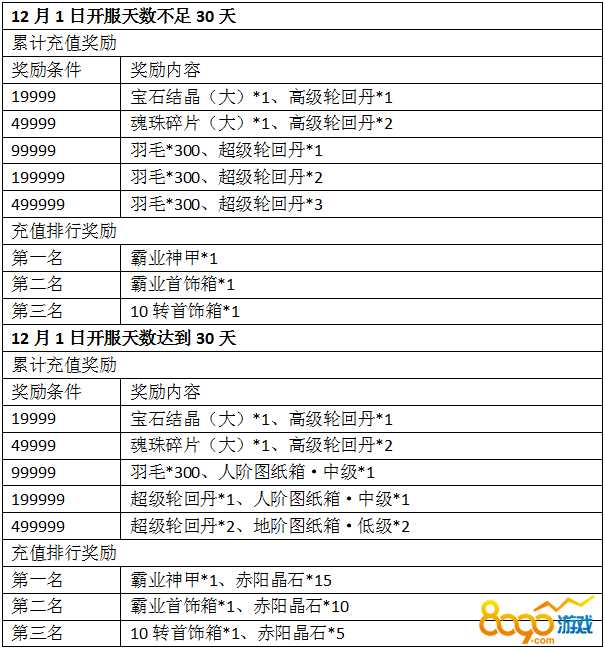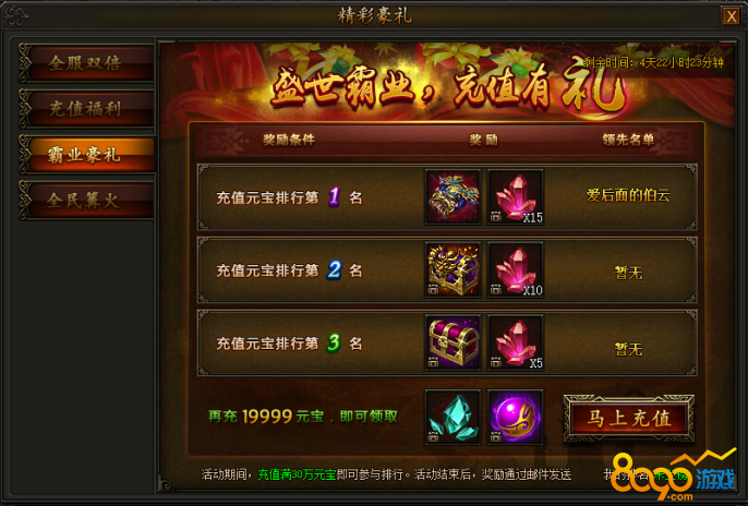 活动期间,累计充值一定元宝即可领取海量奖励。充值元宝数满30w可参与排行,排行前三即可获得对应霸业装备和极品首饰奖励。
