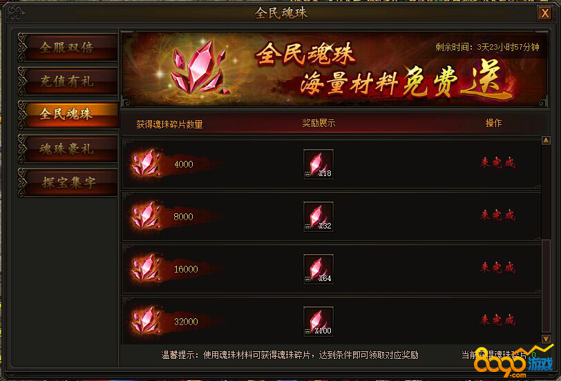 活动期间,使用魂珠碎片大、中、小材料获得魂珠碎片,获得碎片数目达到6000即可参与碎片获得排行,有机会获得霸业装备、极品首饰奖励!活动结束后,奖励通过邮件发送。