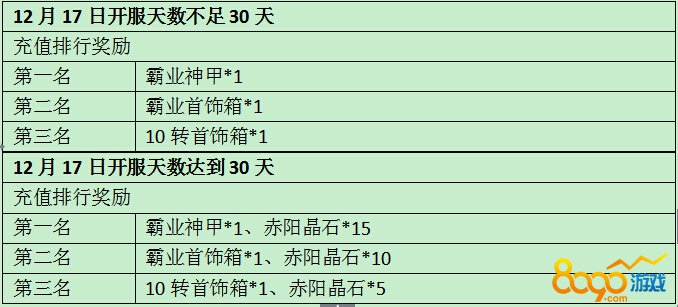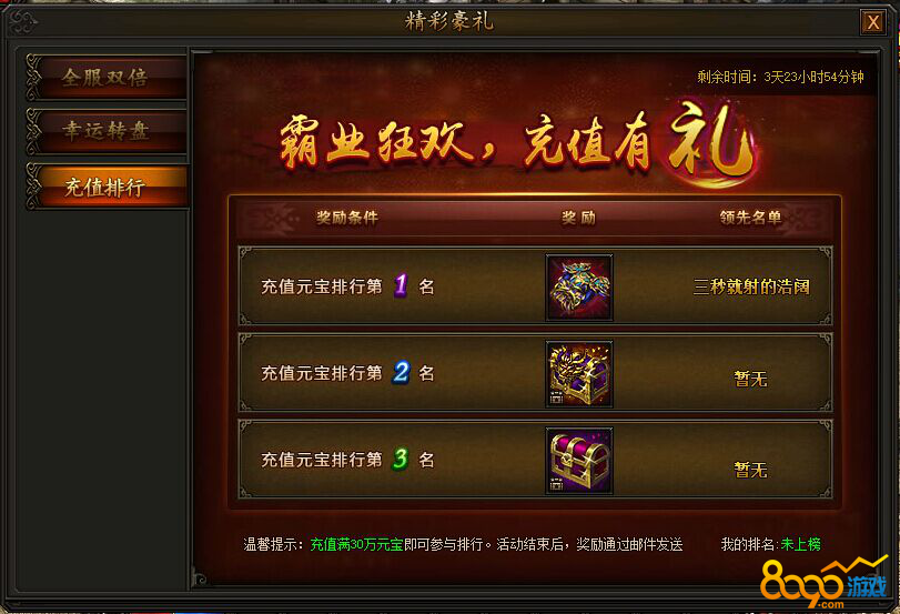 活动期间,累计充值元宝数满30w即可参与排行,排行前三即可获得对应霸业装备和极品首饰奖励。