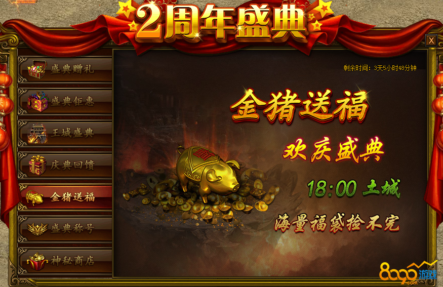庆典期间,每天18:00开始,在土城安全区外,每隔5分钟时间刷新大量金猪boss,共刷新六次,击杀boss可以拾取海量霸业福袋,使用福袋随机获得大量霸业玉和巨额元宝。