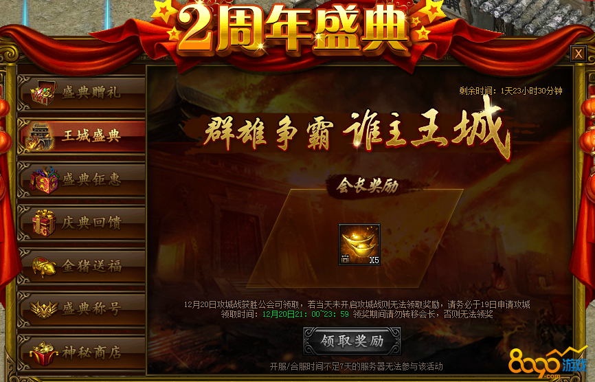 群雄争霸,谁主王城!王城盛典荣耀开启,12月20号参与攻城战并取得胜利的公会可领取海量元宝奖励!