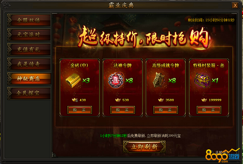 活动期间,每2小时神秘商店会自动刷新一批道具,也可花费元宝立即刷新,大量道具限时等你抢购。