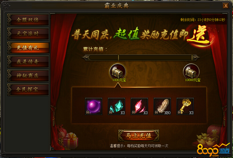 活动期间,充值元宝即可领取两档丰厚奖励,每天均可领取一次,不容错过!