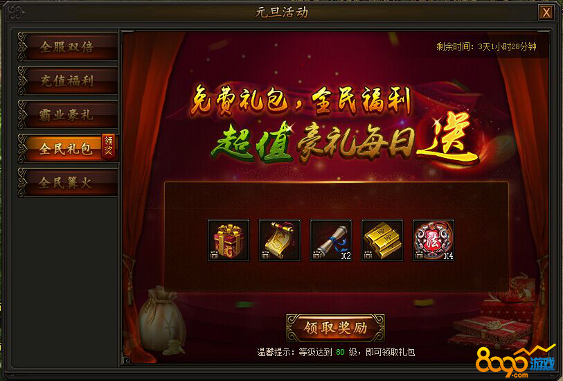 活动期间,80级以上(包含80级)玩家登录即可领取免费奖励,每天均可领取一次。