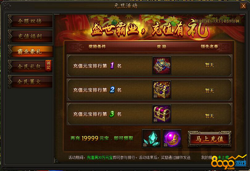 活动期间,累计充值一定元宝即可领取海量奖励。充值元宝数满30w可参与排行,排行前三即可获得对应霸业装备和极品首饰奖励。