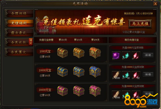 活动期间,充值满一定数量元宝,即可领取每日充值元宝对应档奖励,每档奖励每天均可领取一次,同时累计充值元宝满一定数量且达到要求天数,还可额外领取对应累计天数充值元宝对应档奖励,机会只有一次,不容错过。