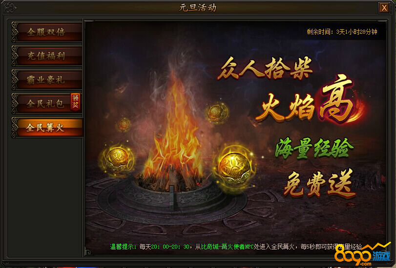 活动期间,每天20:00篝火开启,80级及以上玩家可从比奇城-篝火使者NPC处进入场景,每5s即可获得大量经验奖励;