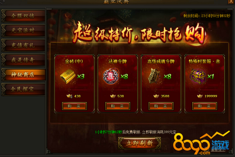 活动期间,每2小时神秘商店会自动刷新一批道具,也可花费元宝立即刷新,大量道具限时等你抢购。