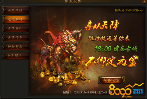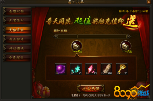 活动期间,充值元宝即可领取两档丰厚奖励,每天均可领取一次,不容错过!