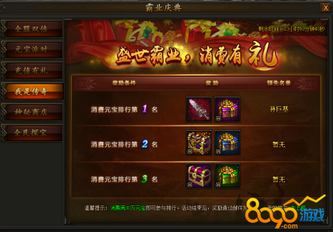 活动期间,累计消费满30w元宝即可参与排行,排行前3名即可获得霸业以及高级转生装备,豪礼不容错过。