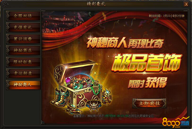 活动期间,充值并消费一定元宝即可使用幸运转盘,获得大量霸业玉道具,使用霸业玉后即可前往霸业商城内购买珍稀道具,精彩不容错过。