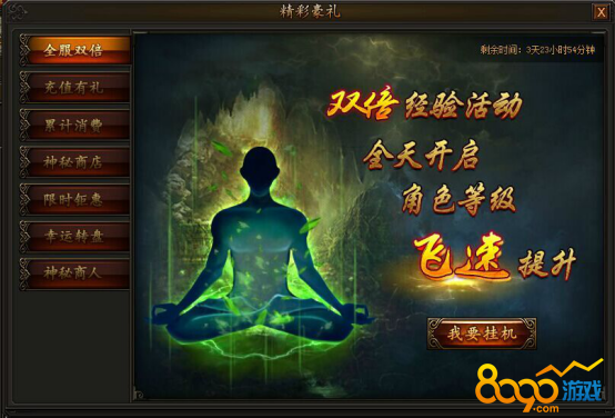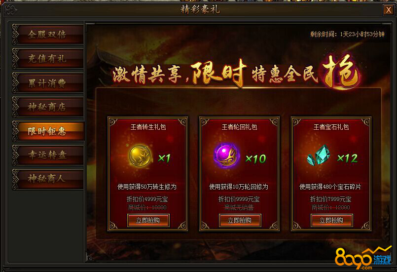 活动第一天和第二天,转生+轮回+宝石材料礼包限时折扣,活动第三天和第四天,内功+羽毛+魂珠礼包限时折扣,超低价格,不容错过!
