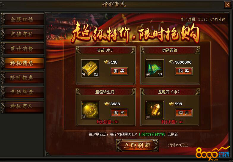 活动期间,每两小时神秘商店会自动刷新一批道具,也可花费元宝立即刷新,大量道具限时等你抢购,还有机会抢购极品时装,不容错过。